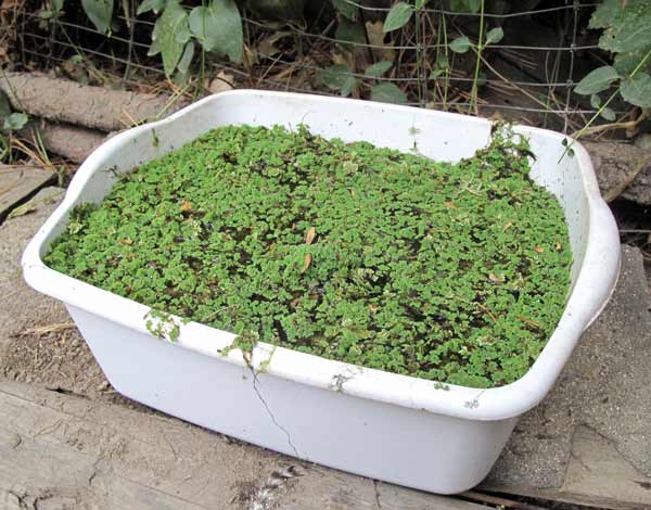 It survived every winter here so far, but if I lived somewhere really cold I would put a bucket somewhere warm where it got sunlight – or in a larger plastic tub – so I would have some to feed through the winter as well. I put in a 21′ x 15′ frog pond this spring so I could grow more of the stuff since it’s so useful and easy to grow.