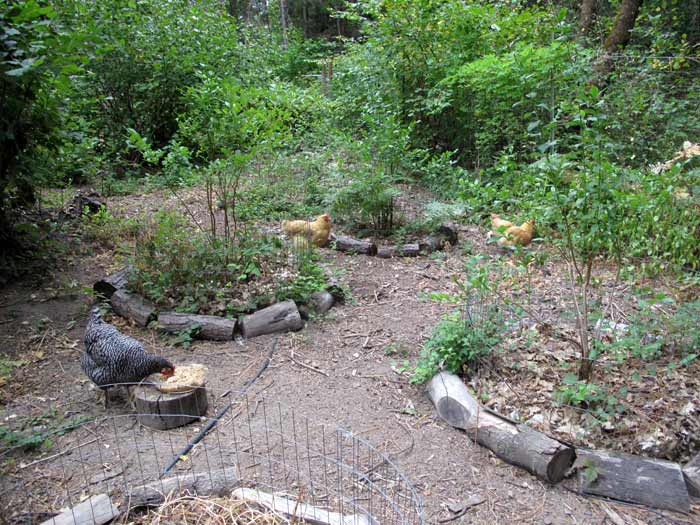 There is also wild Oregon trailing blackberry growing in this area that the chickens have not managed to dig up. Probably has to do with the dainty thorny stems – or maybe this blackberry is just too tough for a chicken to kill… It has proven too tough for me! But they enjoy the little sweet berries in the summer, so I only hack it back every other year or so.
