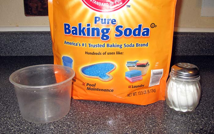 I use a cottage cheese size plastic container that I keep in the bathroom. I fill it with hot water before I get in the shower, and mix in about a tablespoon of baking soda, until it dissolves. Then I wet my hair down in the shower and slowly pour the baking soda solution on my hair – scrubbing it in with the other hand as I go. When the container is empty, I scrub with both hands for a few minutes. Baking soda tends to make water slippery – so your hair will be a bit slippery-feeling. Then I rinse really well and rinse out the container while I’m at it.