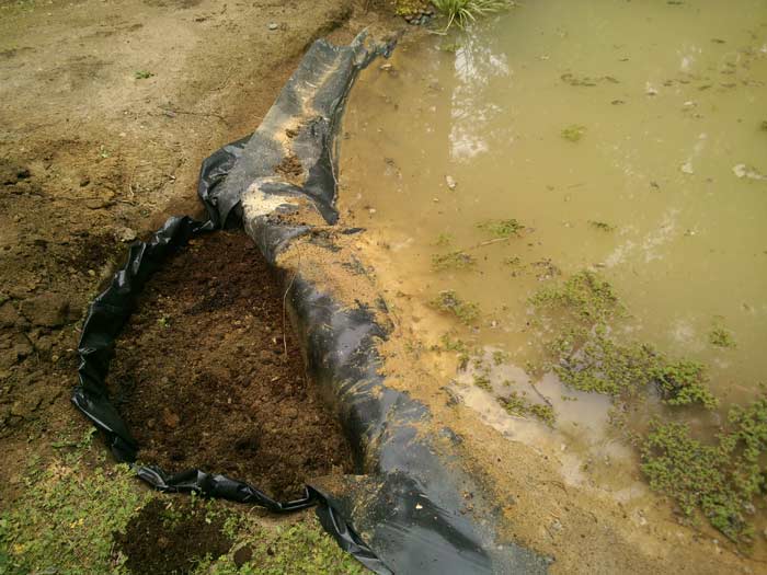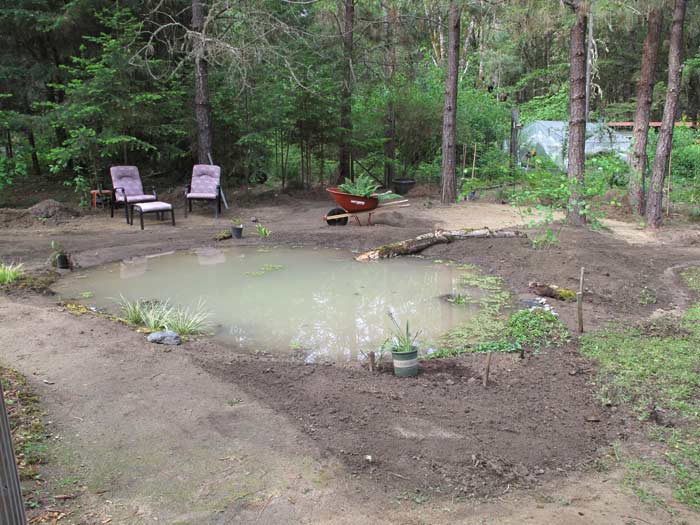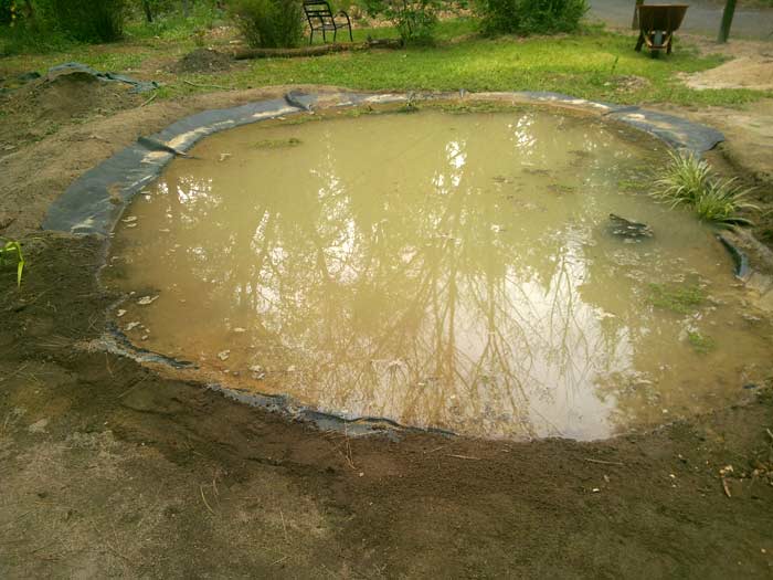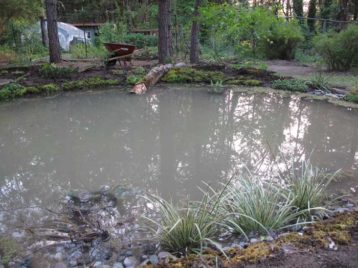 We saved some of the soil from the pond excavation to put back into the pond after the liner was installed. We spread an inch or two of mostly subsoil over the whole liner, because it wouldn’t be as likely to have lots of nutrients that would encourage algea growth. The one drawback was that it had a fair amount of clay in it, and the superfine particles hung suspended in the water for several weeks making it very cloudy. I wondered for a while if the water would EVER clear – but it finally did! It has been clear ever since. I spread river sand over the soil on the shallow “beach” end of the pond, which I think helps keep the water clear when the raccoons wander in and out.