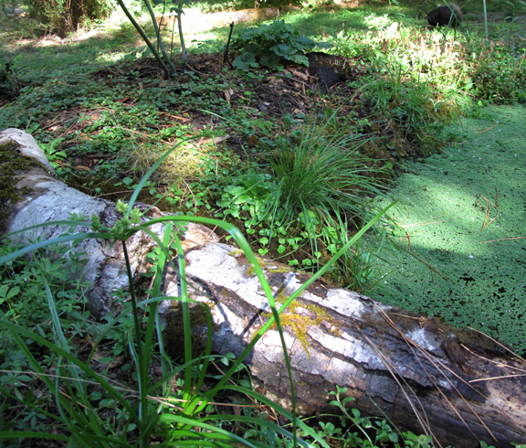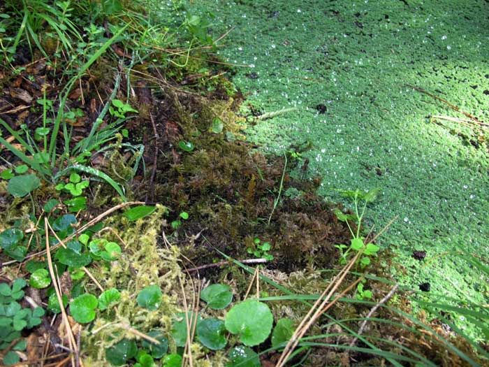 The first thing I did was collect moss from the woods and patches of Self-heal (Prunella vulgaris) that has volunteered here and there in the garden, because I knew it would be happy in the damp environment of a pond edge. It’s a dense low growing, perennial, mostly evergreen, ground cover with pretty lavender blue flowers in summer. As the common name implies, it was once a popular medicinal herb – so in my book that made it even more welcome in my garden. It’s not difficult to get rid of in places that I really don’t want it. That’s an important criteria for me. If a “volunteer” puts down deep tap roots or in some ways makes itself really hard to remove from a place I don’t want it – it may not find me a very welcoming hostess. I bordered about a third of the pond with self-heal and most of the berm edge with moss. The soil along the beach edge is slowly growing moss on its own and a bit of grass which I may or may not leave.