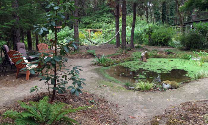 Here it is 6 months later and the pond has truly become the center of activity – and non-activity – here. It attracts humans just like it does raccoons, dragonflies and frogs! Everyone seems as enchanted by it as I am, so it’s not only a useful, functional part of my garden, but a lovely bit of “soul food” as well.